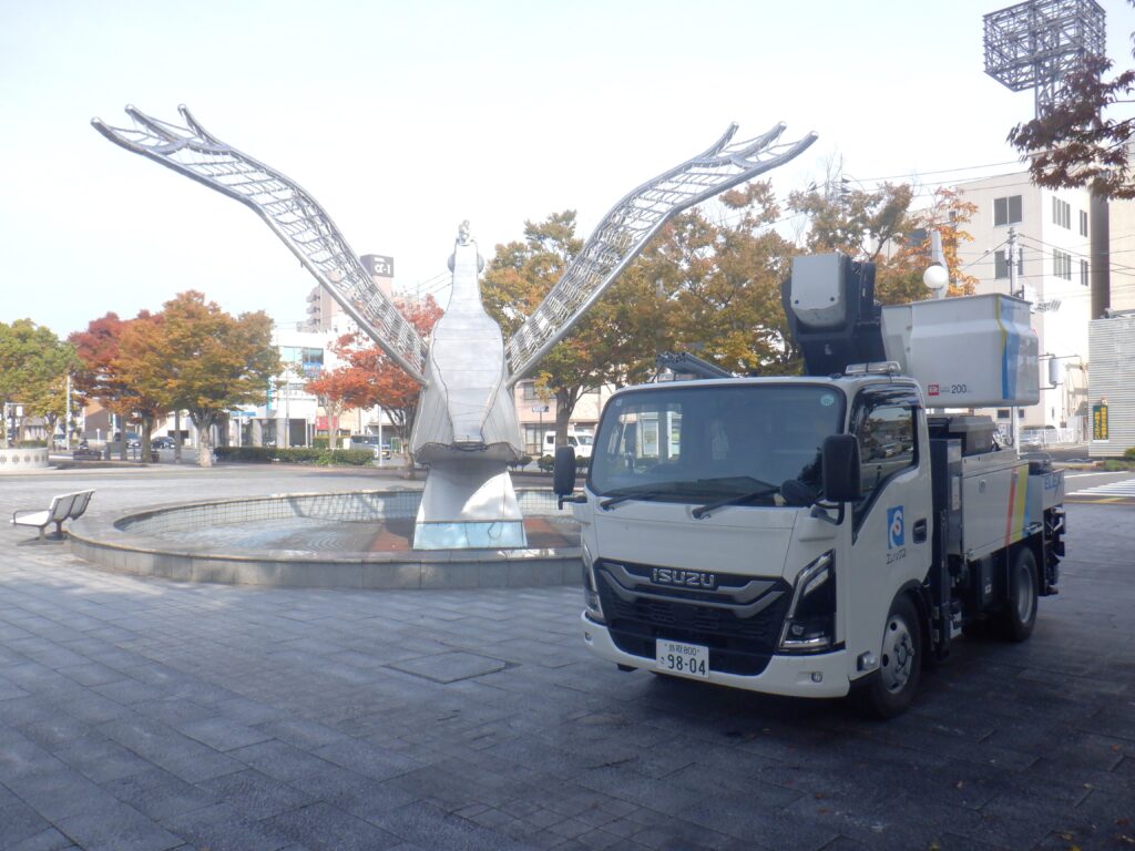 毎年恒例となったこの取り組みで、本日は、米子市文化ホール前の“白鳥オブジェ”や”街路樹”のイルミネーションの修理・取付けを実施。冬の街並みに、あたたかな光を灯しました。